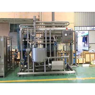 滅菌機(jī)由平衡罐輸入到換熱器內(nèi),在加熱部分與殺過(guò)菌的熱物料進(jìn)行換熱后使冷物料溫度升到預(yù)定值,然后通過(guò)由蒸汽加熱的水間接加熱到120℃,物料在持溫管中維持所要求的溫度一段時(shí)間進(jìn)行超高溫殺菌,從持溫管出來(lái)后與進(jìn)入機(jī)內(nèi)的冷物料進(jìn)行熱交換,后在冷卻段冷卻到預(yù)定的出口溫度,整個(gè)過(guò)程均在封閉狀態(tài)下進(jìn)行,達(dá)到保證物料的生物穩(wěn)定性的目的。