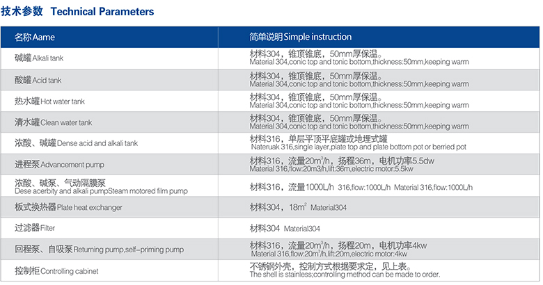 濃酸、濃堿液在埋地式濃酸、濃堿缸中進(jìn)行;罐內(nèi)液位自動(dòng)控制并有溢流保護(hù)系統(tǒng);出料口結(jié)構(gòu)可以防止清洗液析出結(jié)晶堵塞管路。